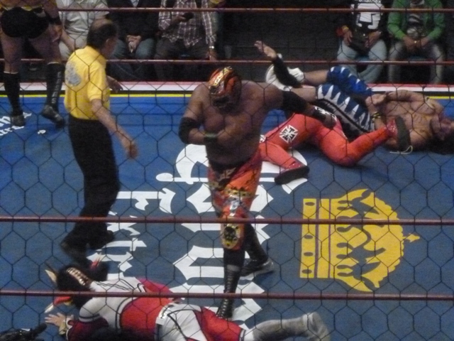 Sagrado vuelve a tomar el control ¡estacas mexicas para Yoshihashi! ¡Sagrado lo lleva al conteo de 3! los técnicos se apuntan una victoria mas. En esta ocasión Azteca si se puso la camiseta técnica e hizo a un lado la pereza que a veces tiene.